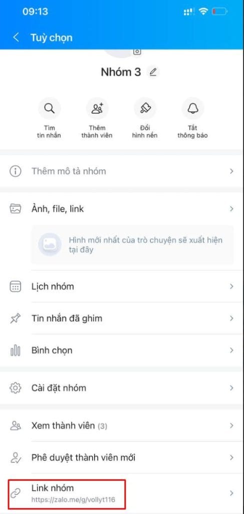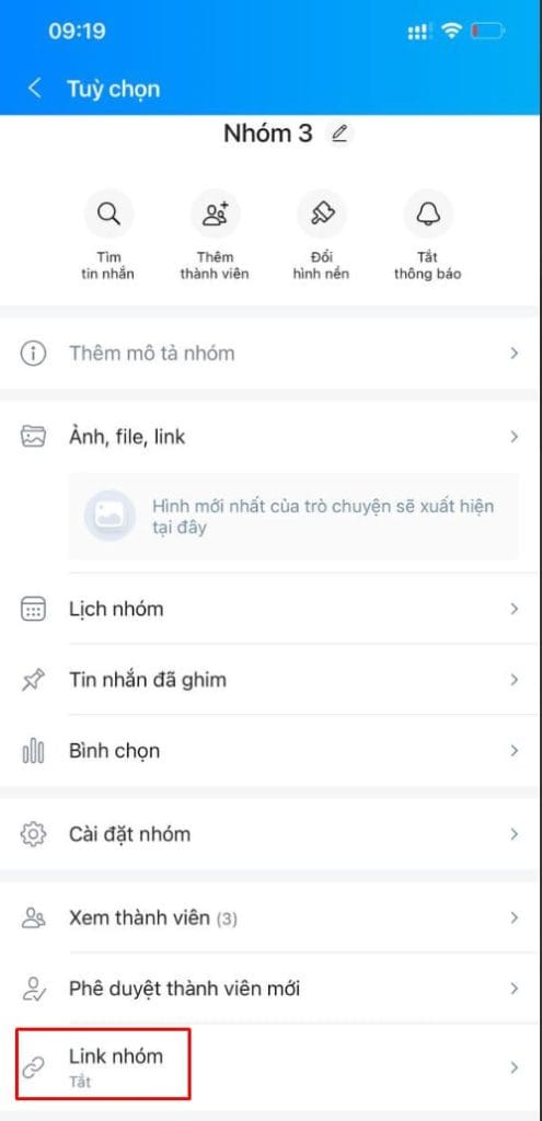 Bước 3: Trong phần cài đặt nhóm, chọn “Link nhóm” để xem đường dẫn mời tham gia hiện tại.