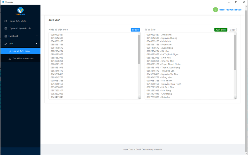 Tool lọc số điện thoại có Zalo, phần mềm lọc Zalo Vina Data